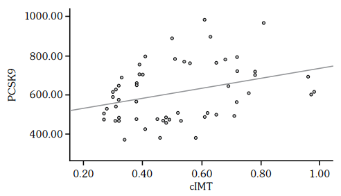 In the multivariate stepwise regression analysis, there was an independent relationship between SA and PCSK9 (beta [β]=0.324, p=0.001). Additionally, there was an independent relationship between carotid plaque and PCSK9 (β=0.265, p=0.006). The regression analysis results are shown in Table 4.