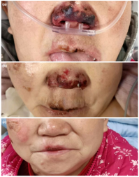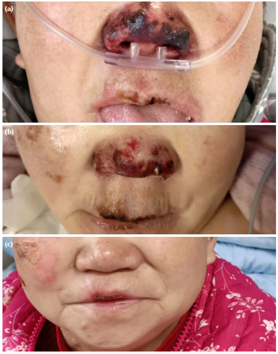 After admission, the patient underwent seven sessions of continuous renal replacement therapy (CRRT), six sessions of plasma exchange (PE), four sessions of intermittent hemodialysis (IHD), imipenem and cilastatin sodium for anti-infection, voriconazole as antifungal, methylprednisolone 40 mg once daily intravenous infusion, and cyclophosphamide 0.6 g intravenous infusion. On Day 4 of admission, the patient had hemorrhagic spots on the nose and white spots on the tongue (Figure 1a). Nasal bleeding was significantly reduced after the second plasmapheresis (Figure 1b). After the fifth plasmapheresis, the nose swelling and bleeding disappeared (Figure 1c). On Day 26 of admission, the urine volume was 3,000 mL within 24 h, and renal function recovered and improved after examination. After six plasmapheresis sessions, thoracic CT exudation decreased significantly (Figure 2). On Day 29 of hospitalization, the patient was discharged with complete improvement, urine volume returned to normal, blood creatinine decreased to 132 µmol/L, and blood culture test result was negative. At a later follow-up, a moderate dose of prednisone (30 mg, gradually reduced to 5 to 10 mg for maintenance) was administered orally combined with cyclophosphamide monthly (0.8 to 1.0 g each time, 6 to 8 g in total) and intravenous drip shock therapy was administered to maintain immunosuppression. No obvious signs of disease were observed.