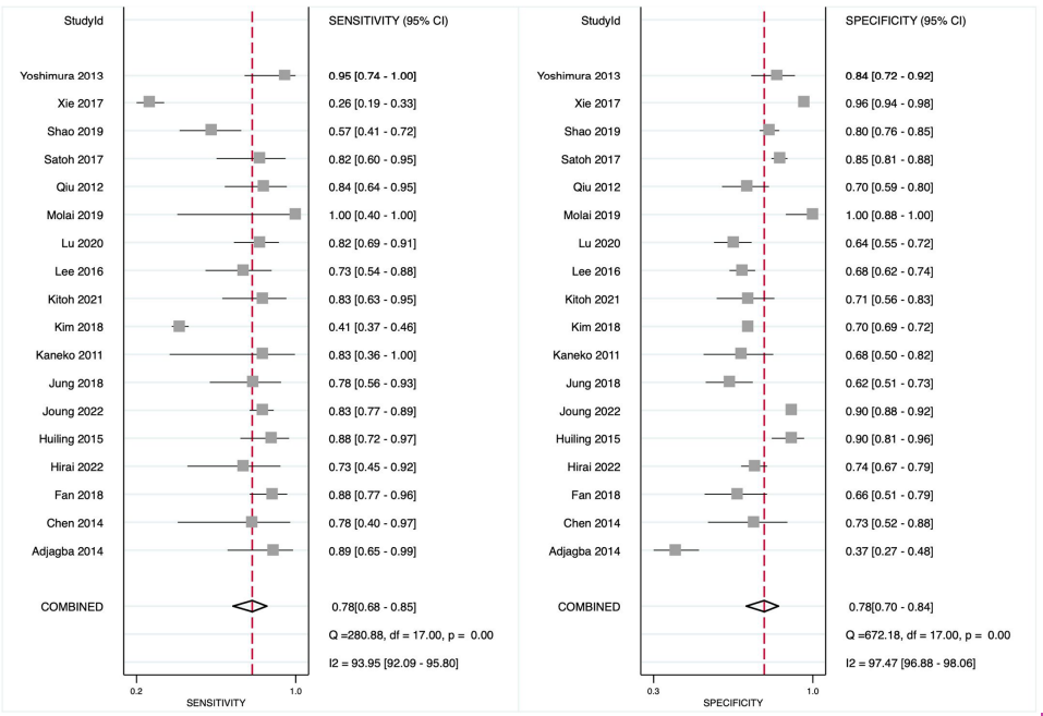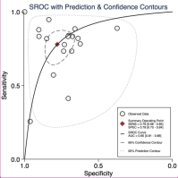 An LR scattergram (Figure 5) demonstrated that the estimates were in the right lower quadrant, indicating that it cannot be used for either confirmation or exclusion. Substantial heterogeneity was observed (I2 = 99%, P < .001), with a minor contribution from the threshold effect (proportion of heterogeneity due to threshold effect = 0.13) (Figure 6). The funnel plot (Supplementary Figure 2) was asymmetrical, and Deek’s test was significant (P= .01).