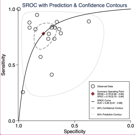 In terms of diagnostic accuracy, the observed AUROC of 0.85 corroborates earlier findings that NT-proBNP performs well as a diagnostic marker, though not sufficiently robust for standalone clinical use. A meta-analysis by Zheng et al. has reported sensitivities ranging from 65% to 85% and specificities from 60% to 90%, consistent with the pooled estimates of this study.[49] However, as indicated by the LR scattergram, NT-proBNP cannot be solely relied upon for confirmation or exclusion, highlighting a limitation that previous studies often overlooked. This insight emphasizes the need for NT-proBNP to be integrated into broader diagnostic frameworks alongside other clinical and laboratory findings.