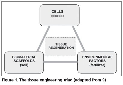 In this triad, the cell is the main character to generate tissue. Native, stem or allogenic cells produce ECM to constitute tissue. Porous scaffolds of adequate structural strength made from absorbable biomaterials provide the habitation for the cells. Cell behavior is controlled by the environmental factors including chemical, physical and biological variables and substances in the culture system[19].