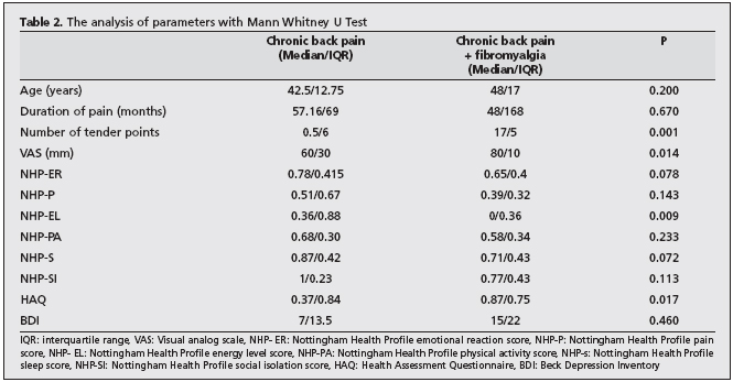 Results: The diagnosis of FMS was estabilished in 15 of 55 (27.3%) patients with CLBP according to American College of Rheumatology criteria. VAS and HAQ scores were higher (p=0.014 and p=0.017 respectively), energy level of NHP was lower (p=0.009) in patients with FMS when they were compared to patients with only CLBP. There were not any significant differences in BDI between groups.