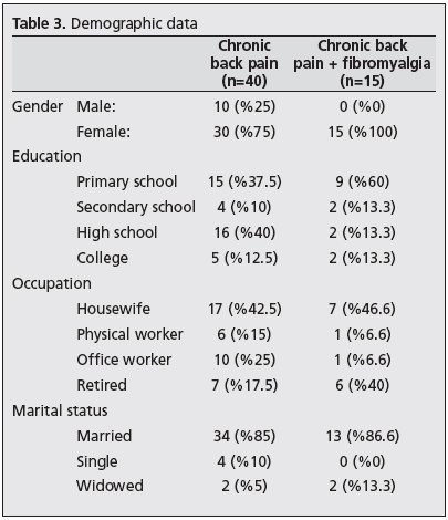The first physician diagnosed 15 and second physician diagnosed 16 FMS patients within 55 patients. In the final analysis it was determined that 15 patients were common in both of the physicians' decisions. In one patient the number of tender points was varied and this patient was not accepted as FMS. The mean age of CLBP was 45.55±11.20 and FMS+ CLBP was 48.20±10.82. All of the patients with FMS+CLBP were females (p=0.04). Fatigue, morning stiffness, paresthesia, neck pain, and number of tender points were significantly higher in FMS+CLBP group (p=0.05, p=0.005, p=0.02, p=0.001, p=0.001, consecutively).