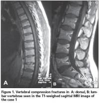 Twenty-six years old female patient was admitted to our rheumatology out-patient clinic with the complaint of low back pain. Her pain started 4 months ago, immediately after delivery of her first child. The pain was aggravated by physical activity and diminished with nonsteroidal antiinflamatory drugs. Lumbar MRI was carried out with the prediagnosis of lumbar disc herniation. Vertebral deformities due to compression fractures were discovered both in the dorsal and lumbar vertabrae (Figure 2), and the patient was hospitalized for differential diagnosis.