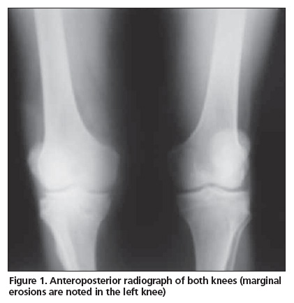 A 72-year-old male patient was admitted to our outpatient clinic with pain, swelling, and limited range of motion of the left knee, and difficulty in walking. His knee complaints had begun suddenly 1 year ago and he also had intermittent right hip joint pain. He had 1 hour of morning stiffness and his symptoms were slightly reduced by activity. He did not have any episodes of infections prior to symptom onset. He did not report fever, weight loss or sweating, and his rheumatologic history was uneventful other than his joint complaints. Despite the use of several non-steroidal anti-inflammatory drugs, there was no improvement in his knee pain, swelling, and range of motion. The anamnesis of the patient was unremarkable except he was treated for pulmonary TB 50 years ago and underwent surgery on his right hip due to trochanteric bursitis 3 years ago. On physical examination swelling and limited range of motion was observed in left knee. After activity, pain and increased temperature was also noted. His right hip joint motion was mildly painful without any limitation. Laboratory investigations revealed a white blood cell count of 6200/uL (normal range; 4800-10800/uL), hemoglobulin level of 12.8 mg/dL (normal range; 12-17 mg/dL), platelet count of 630.000/uL, erythrocyte sedimentation rate of 59 mm/h (normal range; 0-20 mm/h), blood glucose level of 110 mg/dL (normal range; 70-110 mg/dL), a C-reactive protein level of 8.99 mg/dL (normal value; <0.3 mg/dL), RF level of 63.70 IU/mL (normal value; <19 IU/mL), and anti-CCP antibody as 21.8 U/mL (normal value; 0-5 U/mL). The synovial fluid examination revealed a white blood cell count of 16.200/uL and a blood glucose level of 12 mg/dL. Marginal erosions were noted on the radiograph of the left knee (Figure 1). The anteroposterior pelvic radiograph revealed a region of ossification lateral to the right hip joint corresponding to the trochanteric bursa region. Magnetic resonance imaging (MRI) of the left knee revealed extensive hyperintense synovial thickening and erosive changes within the joint cavity, including all knee compartments and the suprapatellar bursa on T2-weighted images (Figures 2, 3). On contrast-enhanced MRI evaluation, fields of necrosis associated with infection showing peripheral enhancement were observed. Bone and joint pathologies defined in these investigations were compatible with infection. The differential diagnosis included arthritis, osteomyelitis, and especially TB, thus the Departments of Infectious Diseases, Chest Diseases, and Orthopedics were consulted. The Department of Infectious Diseases recommended that two consecutive joint aspiration samples should be screened for acid-resistant bacilli (ARB). Indeed, ARB were detected in both joint aspiration fluid samples. On lung tomography, as recommended by the Department of Chest Diseases, revealed fibrotic scars in the bilateral upper lobes, which were thought to be secondary to previous infection. Arthroscopic debridement was performed by the Department of Orthopedics and the biopsy result was compatible with a granulomatous inflammatory reaction. The patient was diagnosed with TB arthritis and treated accordingly. Clinical and laboratory improvement was noted on follow-up.