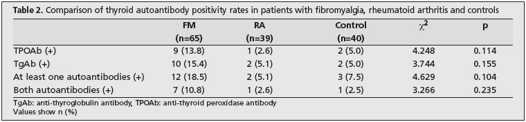Results: The rates of TPOAb and TgAb positivity were 13.8% and 15.4%, 2.6% and 5.1%, and 5.0% and 5.0% in the FM, RA, and control groups, respectively; there was no significant difference between the groups. Thyroid autoimmunity was noted in 18.5%, 5.1%, and 7.5% of the patients in the FM, RA, and control groups, respectively; there was no significant difference between these groups. There were significant differences between the groups with respect to widespread pain, sleep disturbances, fatigue, and morning fatigue evaluated by VAS and the mean FIQ and BDI scores; the highest values were noted in the FM group. Significantly higher ESR, CRP and TSH levels, and proportion of postmenopausal women were noted in FM patients with thyroid autoimmunity compared to FM patients without thyroid autoimmunity. No significant difference existed between RA patients with or without thyroid autoimmunity.