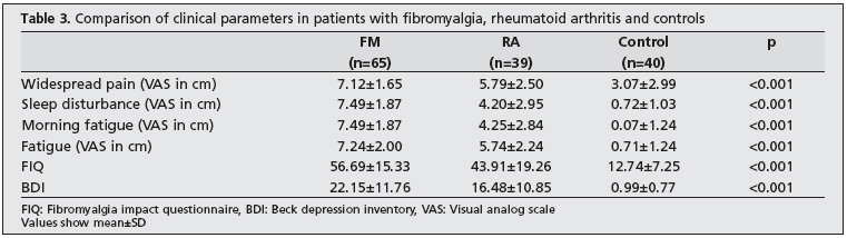 The mean severity of widespread pain and sleep disturbance assessed by VAS was 7.12±1.65 and 7.49±1.87, 5.79±2.50 and 4.20±2.95, and 3.07±2.89 and 0.72±1.03 in the FM, RA, and control groups, respectively. The three groups were different in terms of VAS-pain and VAS-sleep disturbance scores and the highest values were noted in the FM patient group (p<0.001). The mean severity of fatigue and morning fatigue assessed by VAS were 7.24±2.00 and 7.49±1.87, 5.74±2.24 and 4.25±2.84, and 1.70±1.69 and 0.07±1.24 in the FM, RA, and control groups, respectively. The highest VAS-fatigue and VAS-morning fatigue scores were noted in the FM patient group and the difference between the groups was statistically significant (p<0.001). The mean FIQ score indicating quality of life was 56.69±15.33, 43.91±19.26, and 12.74±7.25 in the FM, RA, and control groups, respectively. The highest mean FIQ score was noted in the FM group and the difference between the groups was significant (p<0.001). The mean BDI score indicating the presence of depression was 22.15±11.76, 16.48±10.85, and 0.99±0.77 in the FM, RA, and control groups, respectively. The difference between the groups was significant (p<0.001). These results are presented in Table 3.