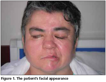A 52-year-old female patient with right idiopathic facial paralysis for three weeks admitted to our outpatient clinic. The patient had a history of hypertension for 17 years and diabetes for 15 years. She was on oral antihypertensive and oral anti-diabetic drugs. She had used steroids for five weeks before her admission to our outpatient clinic. The patient's history did not indicate the use of any other drugs. She experienced left facial paralysis three times (in 1998, 2003 and 2004; two ipsilateral and one contralateral). Her sister also reported an episode of right idiopathic peripheral facial paralysis, but only once, and without recurrence. The patient did not have any history of recurrent viral infection, alcohol consumption or smoking.