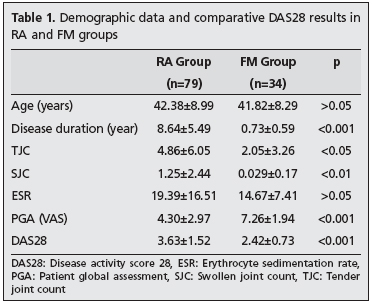 Of the patients recruited in the study, the mean age of the 79 patients with RA was 42.38±8.99 years and of the 34 patients with FM was 41.82±8.29 years, and there was no statistical difference between the two groups (p>0.05). The mean duration of disease in the RA group was 8.64±5.49 years and in the FM group was 0.73±0.59 years, and the difference between groups was significant (p<0.0001).