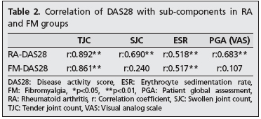 Conclusion: Although there is no objective injury such as inflammation or joint damage, FM can decrease the quality of life to the same extent as RA. FM, which is a non-inflammatory disease, can cause high rates in DAS28-4v due to the fact that there are many subjective complaints such as the TJC and the PGA. The intervening infections during the evaluation of disease activity in RA or concomitant diseases like FM might cause fluctuations in the DAS28-4v score. (Turk J Rheumatol 2010; 25: 179-83 )