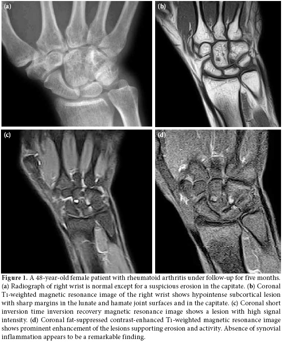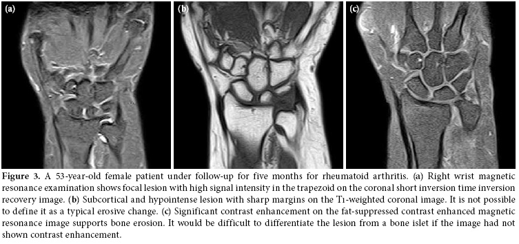 In conclusion, MRI may an effective diagnostic method in the detection of early stage joint involvement and the determination of the disease activity in RA cases. In patients suspected of having arthritis, if the diagnosis is based on radiological findings, then MRI should be preferred over conventional radiography. In particular, contrast enhancement on T1-weighted images in areas suspected of erosive change supports bone erosion. In cases where synovial thickening and contrast enhancement are not present, erosive changes may occur all the same. Further studies are needed on this subject.