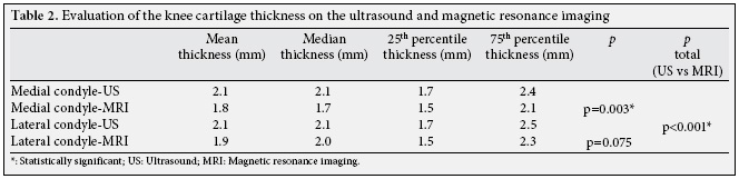 Results: In the comparisons of the results of US and MRI examinations, both modalities were mostly concordant. A significant rate of concordance was found between US and MRI results, for joint effusion (k=0.683, p<0.001) synovial proliferation (k=0.595, p<0.001), popliteal cysts (k=0.865, p<0.001) and tendonitis (k=0.889, p<0.001). On the US, the mean medial and lateral femoral condylar cartilage thickness was calculated as 2.1 mm on both sides, whereas the MRI revealed 1.8 mm on the medial and 1.9 mm on the lateral part. In the statistical analysis, the condylar cartilage was significantly thicker on the US than on the MRI (p<0.001). On the other hand, there was a significant correlation between two modalities regarding the cartilage morphology, both on the medial (k=0.658, p<0.001) and the lateral part (k=0.851, p<0.001).