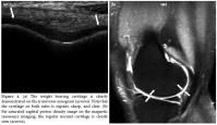 In the second position, the weight bearing medial and lateral femoral condylar cartilage thickness and clarity were evaluated with the knee in maximum flexion. The femoral condylar cartilage was measured on the weight-bearing area approximately 1.5 cm away from the intercondylar notch (Figure 3). The cartilage morphology was assessed using a scale: 1 for regular-clear (Figure 4a, b) and 0 for irregular, non-clear (Figure 5a, b). Finally, all the patients were evaluated for popliteal cysts with the knee extended in a prone position, and any presence of popliteal cysts was recorded.
