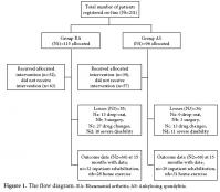 A flow diagram of this study with the pool of potential patients showing that all were registered and randomized was shown in Figure 1. The online recorded, pre-planned study population was 115 patients with RA and 96 patients with AS.