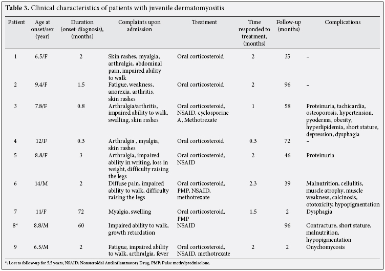 Results: The female to male ratio was 2:1. The median age at onset of the disease was 8.8 years (range 6.5-14 years), the median duration of symptoms before diagnosis was two months (range 10 days-72 months), and the mean time of follow-up was 49.5 months (range 2-96 months). The main presenting complaints were arthritis/arthralgia, myalgia, an impaired ability to walk, and skin rashes. Eight patients received oral steroids as the initial therapy. Additionally, two patients received intravenous methylprednisolone, and five received non-steroidal antiinflammatory drugs during the follow-up. Three patients received methotrexate, and one received cyclosporine A. The median time to treatment response was 60 days (range 10-70 days). Pathological proteinuria was found in two patients. Subcutaneous calcinosis developed in one patient. Skin and soft-tissue infections occurred in two patients. Other complications seen during the follow-up were malnutrition, obesity, depressive mood, ototoxicity, muscle weakness, osteoporosis, and contractures.