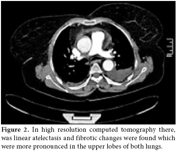 In high resolution computed tomography (HRCT) there was linear atelectasis, and fibrotic changes were found which were more pronounced in the upper lobes of both lungs (figure 2). Mild to severe pericardial effusion was seen in echocardiography (ECHO; figure 3). Three days after 20 mg intravenous prednisolone therapy, fluid accumulation was considered to be gradually decreasing in ECHO (figure 4).
