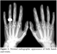 All of the laboratory test values (hemogram, routine biochemistry, C-reactive protein, and rheumatoid factor) were within normal limits. Radiographs of both hands and wrists (figure 2) were also found to be normal. After these results, a three-phase bone scan (Technetium-99m) was obtained. It showed diffuse increased uptake and hyperemia in the right wrist in the first phase, and diffusely increased uptake in the right wrist, metacarpals, and phalanges in the third phase (figure 3). The appearance was scintigraphically compatible with CRPS.