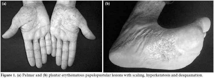 Tumor necrosis factor (TNF) antagonists are available for treatment of the common rheumatic diseases rheumatoid arthritis (RA), ankylosing spondylitis (AS), psoriatic arthritis (PsA) as well as Crohn's disease and psoriasis.[1] Unexpected side effects of TNF antagonists increasingly reported in the literature are cutaneous adverse reactions which include skin rash, urticaria, hyperhidrosis, seborrheic dermatitis, alopecia, rosacea injection site reactions, non-melanoma skin cancer, lupus-like syndrome, erythema multiforme, Steven's Johnson syndrome and toxic epidermal necrolysis or psoriatic skin lesions.[2-4] Also, worsening of psoriatic skin lesions due to anti-TNF treatment has been reported in patients with PsA.[5] Here we report on a patient with AS who developed palmopustular psoriasis during successful treatment with adalimumab.