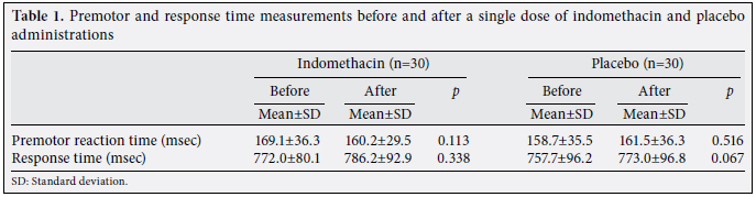 The mean values of the premotor and response time measurements before and after a single dose of indomethacin and placebo are presented in Table 1. The mean baseline values of the premotor and response times were similar with both (p=0.058; and p=0.224, respectively). There was no statistically significant difference after taking the placebo or indomethacin compared with the baseline values.