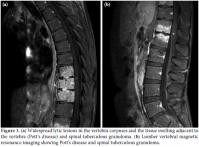 A 22-year-old male patient was presented to the emergency room of our hospital with complaints of fever, headache, and fatigue which had been occurring for 10 days. The medical history revealed that he had been diagnosed as having Behçet’s disease in 2007 and had been using prednisolone since the time of diagnosis. The dosage of prednisolone was increased up to 64 mg/day by the supervising clinician. Cyclosporine-A had been added to the treatment at 100 mg/day two months previously due to eye involvement but was discontinued after one week due to side effects of fever, fatigue, and headache. The patient was prescribed azathioprine at 100 mg/day on the follow-up visit, and he had been using this drug for nearly 10 days prior to being admitted to our hospital. The physical examination findings revealed a body temperature of 39.8 °C, arterial blood pressure of 110/70 mmHg, and a heart rate of 112/per minute. Neck stiffness was minimally positive. He had swelling and sensitivity on palpation in the right scrotal region that had started three months earlier. Laboratory examinations were as follows: leukocyte count 7.400/mm3, erythrocyte sedimentation rate 87 mm/h, C-reactive protein: 13.4 mg/dl in cerebrospinal fluid (CSF) analysis, leukocyte count: 20/mm3, protein: 200 mg/dL, and glucose: 27 mg/dL (blood glucose: 94 mg/dL). There was no growth on the CSF culture. A chest X-ray was normal. Since the CSF findings and physical examination results could not rule out bacterial meningitis, he was started on ceftriaxone 2x2 gr intravenously. He had no regression of complaints in the first week of treatment, and his antibiotic treatment was discontinued. Internal disease and neurology consultations in conjunction with the clinical findings and CSF results led to a diagnosis of neuro-Behçet’s disease. Scrotal ultrasound screening was consistent with epididymitis. A large number of leukocytes were observed in the material aspirated from the testis (90% lymphocyte in nature). Ehrlich- Ziehl-Neelsen (EZN) staining detected acid-resistant bacteria. Treatment with isoniazid, ethambutol, pyrazinamide, and rifampicin was initiated under the diagnosis of testis tuberculosis. Subsequently, chest high resolution computed tomography (HRCT) and brain magnetic resonance imaging (MRI) were done. The chest HRCT result was consistent with miliary tuberculosis (Figure 1), and the brain MRI revealed findings were consistent with tuberculous granuloma and tuberculous meningitis (Figure 2). The vertebral MRI showed that widespread lytic lesions in the vertebra corpuses and the tissue swelling adjacent to the vertebra were consistent with Pott’s disease and spinal granuloma (Figure 3a and 3b). Based on these examinations, the patient was considered to have disseminated tuberculosis (testicular tuberculosis, miliary tuberculosis, tuberculosis meningitis, spinal granuloma, and Pott’s disease). The anti-tuberculous treatment was revised with the ethambutol being replaced by streptomycin. The patient’s body temperature returned to normal on the eighth day of treatment. The patient, whose general condition was observed to improve, is still receiving the treatment.