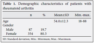 The demographic and clinical characteristics of the patients are presented in Tables 1 and 2. It was found that 46.7% of patients had one or more comorbid disease, and 17.2% of the patients presented with osteoporosis (Table 3). The percentage of RA patients found to have one or more extra-articular involvement was 21.5%, and the most frequent type was pulmonary involvement (Table 4).