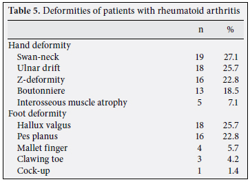 Seventy (29.53%) of the 237 cases who underwent final examinations had at least one deformity. The hand and leg deformities in the RA patients are given in Table 5.