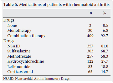 Patients’ medications, determined at their last follow-up visit, are provided in Table 6. The percentage of patients who underwent combination therapy was 92.7%, and 6.8% had monotherapy. A very small percentage (0.5%) took no drugs. Therefore, determining clinical scores in order to make a statistical comparison between patients who used diseasemodifying antirheumatic drugs (DMARDs) and those who did not was impossible.