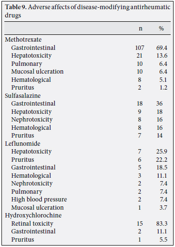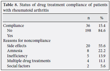 Non-medical treatments as recommended to the patients are shown in Table 7, and the drug compliance rate and reasons for noncompliance are given in Table 8. The side effects caused by DMARDs are provided in Table 9.