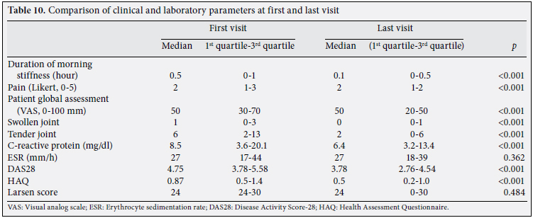 Results: Significant improvements were found in DAS28 and HAQ levels at the last visit, compared to baseline (p<0.001), while no significant change was observed in Larsen scores (p=0.484). Significant improvements were also observed only in CRP values at the last visit, compared to baseline (p<0.001). DAS28 scores of the patients without extra-articular involvement with a good compliance were found to be lower than in the others at the last visit (p=0.043, p<0.001).