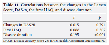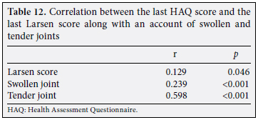 Correlation analysis between the HAQ value and the Larsen score as well as the number of tender and swollen joints is shown in Table 12.