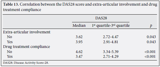 Comparison of the final DAS28 score and extraarticular involvement along with drug compliance are provided in Table 13.