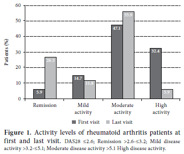 Conclusion: Our results indicate that disease-modifying antirheumatic drug (DMARD) treatment in combination with regular follow-up is of utmost importance for the suppression of the disease activity in RA patients. Patients should be educated on drugs, as those with good compliance showed a better disease activity level.