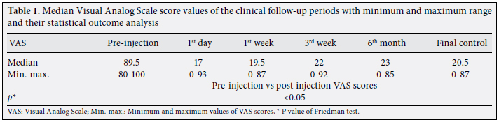 Two types of statistical analyses were performed for this study. Distributions of the variables were controlled by the Shapiro-Wilk test, and they were not normal. For this reason, the median VAS scores before and after the injections were compared using Friedman’s test, and then multiple comparisons between pairs of VAS scores were carried out according to the Bonferroni/Dunn test. Results were expressed as number of observation (n), median VAS scores with minimum-maximum values, and interquartile range (IQR). All calculations were performed using the SPSS 17.0 software package (SPSS Inc., Chicago, Illinois, USA), and the significance level was set at p<0.05 with a 95% confidence interval (CI).