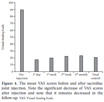 Patients and methods: Between January 2009 and December 2011, a total of 46 patients (18 males, 28 females; mean age 52.7 years; range 41 to 65 years) with SIJ pain who were scheduled to undergo an injection with a CT-guided intraarticular steroid and a local anesthetic were included. After properly prepared, the mixture of triamcinolone acetonide 80 mg and bupivacaine hydrochloride 4 cc was injected under CT guidance. The pain was evaluated using the visual analog scale (VAS) before and after the injection. The clinical follow-up was performed the day after the injection as well as at one week, three weeks, and six months and in the last visit. The differences between the VAS scores before and after the injections were analyzed statistically.