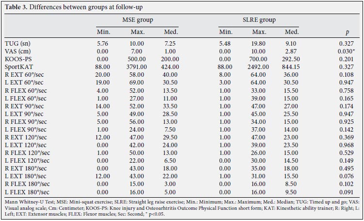 Results: No significant difference was found in static balance testing parameters after exercise program (EP) (p=0.659) and during follow-up period (p=0.327) between the groups. There was no significant difference in KOOS-PS scores after EP (p=0.398) and during follow-up (p=0.201) between SLRE and MSE groups. There was no significant difference in VAS scores af ter EP (p=0.149), however significant difference was found during follow-up (p=0.030) between SLRE and MSE groups. Mini squat exercise group had significantly higher TUG scores and higher right knee extensor torque at 60°/sec (p=0.024), 90°/sec (p=0.003), 120°/sec (p=0.005) and 180°/sec (p=0.017) compared to the SLRE group at the end of EP.