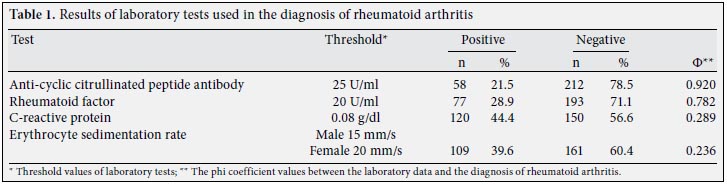 Results: A total of 270 patients were examined in a physical medicine and rehabilitation clinic. The results for anti-CCP, RF, CRP, and ESR were positive in 58 (21.5%), 77 (28.9%), 120 (44.4%) and 107 patients (39.6%) respectively. Among these patients, a total of 67 were diagnosed with rheumatoid arthritis (RA). When we considered the association of ESR, CRP, RF, and anti-CCP positivity with RA diagnosis, both anti-CCP (F=0.920) and RF (F=0.782) had a high positive correlation with RA. There was a close association between CRP (F=0.289) and ESR (F=0.236). Each of them had a moderate correlation with RA.