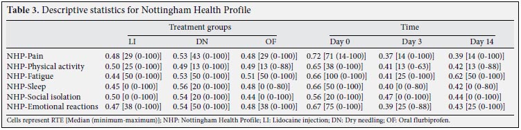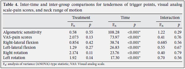 Although there were no significant differences between the groups in terms of age and duration of symptoms, the gender distribution was different (Table 1), but since gender is not a factor that affects the response to the treatments in MPS, the authors ignored this difference. The descriptive statistics of the groups are presented in Tables 2 and 3. The groups were similar in terms of pre-treatment algometric sensitivity, VAS-pain scores, restrictions regarding neck range of motion, and NHP. The p values are provided in Tables 4 and 5.