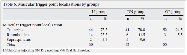 The number of active trigger points was between one and six in all the groups. In the LI group, the median number of active trigger points was three, whereas it was two in the DN and oral flurbiprofen groups. The groups were similar in terms of the number of active trigger points, (p=0.67) and these were localized at the trapezius, supraspinatus, and rhomboideus muscles. There were not similarities in terms of the muscles involved. This difference was also ignored because the muscle that is involved is not a factor that influences treatment response. The distributions of the trigger points to the muscles are given in Table 6.