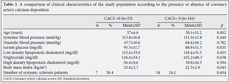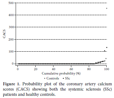 Patients and methods: Between January 2007 and December 2009, 41 female SSc patients and 123 age- and gender-matched healthy subjects who were admitted to a tertiary healthcare center in South Korea were retrospectively analyzed. The CACS were measured using multidetector computed tomography (MDCT) and categorized as either absent (CACS=0), minimalto- mild (CACS=1-100), or moderate-to-severe (CACS≥101). We also collected data from each patient related to conventional cardiovascular risk factors.