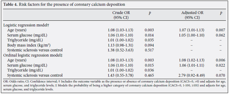 The subjects who had a CACS of >0 were significantly older (p=0.002) and had higher serum glucose (p=0.035) and TG (p=0.038) levels combined with an increased BMI (p=0.043) compared with those with a CACS of 0 (Table 3). In a stepwise multivariable logistic regression analysis, SSc was not independently associated with the presence of coronary calcium deposition (CACS >0) after adjustments were made for age, serum glucose, TGs, and BMI (Table 4). Furthermore, in a stepwise multivariable ordinal logistic regression model, although the SSc patients were more likely to have a higher category of CACS (OR 2.79; 95% CI 0.92-8.49; p=0.070) compared with the healthy controls after adjusting for age, serum glucose, and TGs, this did not reach statistical significance (Table 4). However, older age was an independent risk factor for coronary calcium deposition in the logistic regression models for both the SSc patients (OR 1.07; 95% CI 1.01-1.13; p=0.007) and healthy subjects (OR 1.08; 95% CI 1.02-1.13; p=0.006). In addition, the increased fasting serum glucose levels (OR 1.06; 95% CI 1.01-1.11; p=0.022) showed a significant association with the higher category of CACS only in the multivariable ordinal logistic regression model (Table 4).