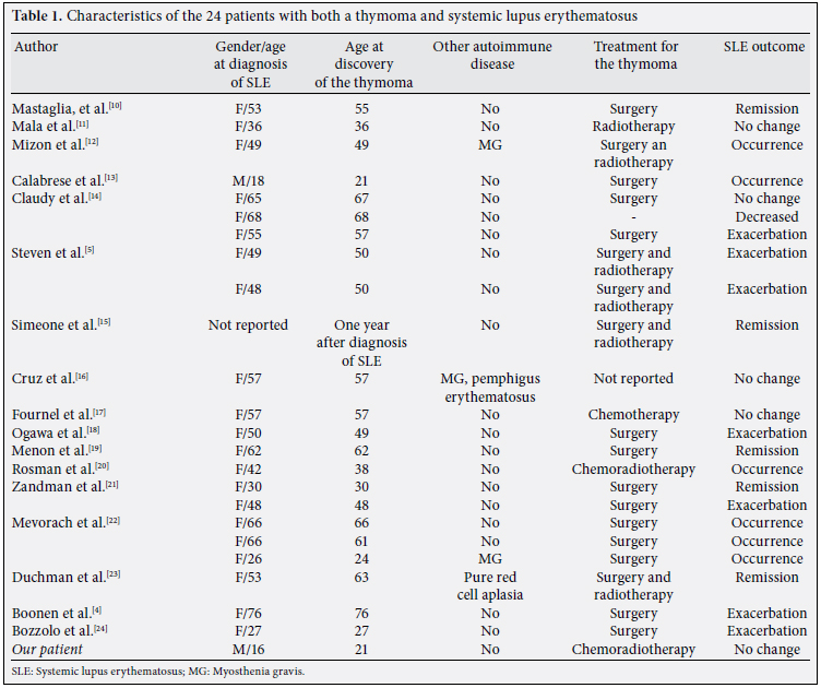 Additionally, we reviewed 24 cases in the literature published in English along with our own case, all of which had relatively detailed information about the patients' clinical features (Table 1),[4,5,10-24] and discovered that most of the patients underwent surgery as the primary treatment for the thymoma, with some combining the surgery with radiotherapy and/or chemotherapy. The outcome of SLE varied after the treatment with remission in five of the 24 patients, exacerbation in seven others, no reported changes in five more, and SLE occurrence in the other six. We also noticed that there were no specific features in these patients with the different outcomes.