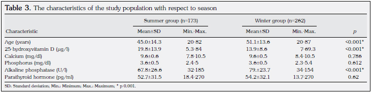 In this study, we analyzed 435 samples (262 winter samples and 173 summer samples). The patients ranged between 20 and 87 years of age (mean 48.72±14.22), and the mean 25-(OH)D status was 16.25±10.98 μ/l. The serum calcium was measured, and the median adjusted calcium was 9.47 mg/dl (range 7.8-10.5 mg/dl). The characteristics of our samples are shown in Table 1.