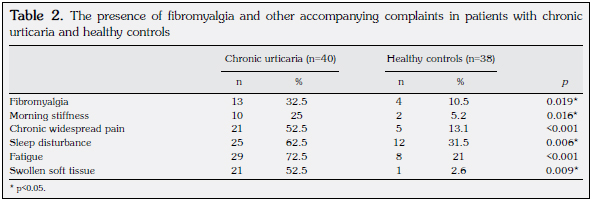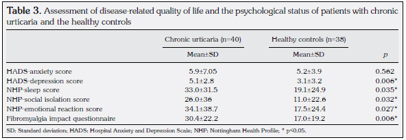 Patients and methods: Forty patients with CU and 38 healthy controls were enrolled to this study. All of the participants were assessed according to the 1990 American College of Rheumatology (ACR) classification criteria for FM and asked questions regarding the clinical features of FM. The quality of life was assessed by the Nottingham Health Profile (NHP), while the psychological status was evaluated using the Hospital Anxiety and Depression Scale (HADS).
