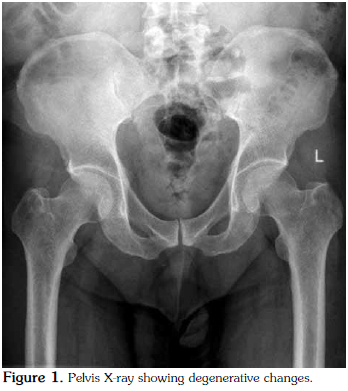 The patient was then admitted for further investigation. From an analytical point of view, there was an increase in acute phase reactants [C-reactive protein (CRP) 95.2 mg/L and erythrocyte sedimentation rate (ESR) 87 mm/hr]. Microcytic anemia was also present (hemoglobin 11.2 g/dL, mean erythrocyte volume 79.4 fl, and iron 37 mg/dl), but the ferritin and serum levels were normal as were the total iron binding capacity and transferrin saturation rate. Serum protein electrophoresis revealed a decrease in albumin (47.3%), whereas the alpha 1 (16.1%), alpha 2 (14.9%), and gamma globulin (21.3%) levels were higher. Other immunological tests determined that the rheumatoid factor (RF), anticyclic citrullinated peptide (anti-CCP), antinuclear antibody (ANA), complement, and anti-doublestranded deoxyribonucleic acid (anti-dsDNA) levels were normal, and the serum uric acid levels were also within normal limits. Furthermore, the primary and secondary tuberculosis screening tests were negative, and the serology tests for Brucella, Chlamydia, the human immunodeficiency virus (HIV), and hepatitis B and C were negative as well. Human leukocyte antigen typing revealed the presence of A1, A2, B41, B57, Cw6/7, DR11, and DR13 while a urinary system ultrasound and an intravenous pyelogram were normal. An X-ray of the pelvis showed degenerative changes (Figure 1), and because of the patient's ongoing lower back pain and peripheral joint swelling, magnetic resonance imaging (MRI) of the sacroiliac joints was performed, which showed periarticular edema of the sacrum in the anterior segment along with a slight increase in sclerosis of the right sacroiliac joint in the anterior superior segment. Slight edema of the left periarticular sacral area was also seen in the posterior segment. We then recommended that the MRI findings be interpreted in accordance with the clinical picture.
