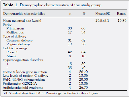 Patients and methods: Fifty pregnant women (mean age 29.5 years; range 19 to 39 years) with FMF were enrolled between January 2002 and December 2012. Patient data were collected from computerized database. Clinical characteristics including demographics, pregnancy outcome, maternal and fetal complications during pregnancy or delivery, hypercoagulation disorders and colchicine use were recorded. Labor patterns and perinatal outcomes were assessed.