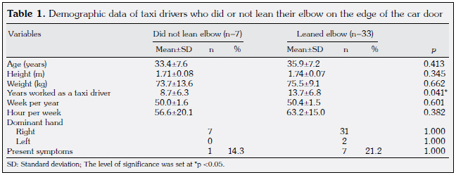 The mean height and weight of the taxi driver group were 1.74±0.07 m and 75.2±9.9 kg, respectively, compared to 1.73±0.08 m and 79.1±11.9 kg, respectively, in the control group. There was no significant difference in demographic data between the two groups.