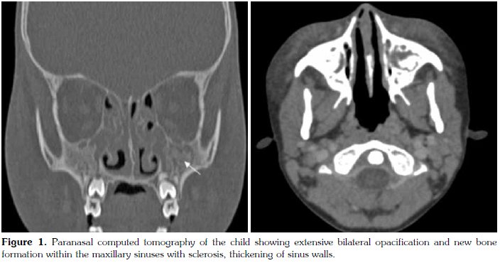 For further evaluation, paranasal CT was performed. The CT showed extensive bilateral opacifications and new bone formation within the maxillary sinuses, with sclerosis, thickening of sinus walls. There was an increased soft tissue thickening and reticulation within the periorbital, peri-zygomatic and premaxillary soft tissues consistent with edema and inflammation. The findings were thought to represent an aggressive and chronic inflammation such as chronic osteomyelitis (Figure 1). Until paranasal infection was ruled out, ampicillin/sulbactam and amikacin therapy were given.