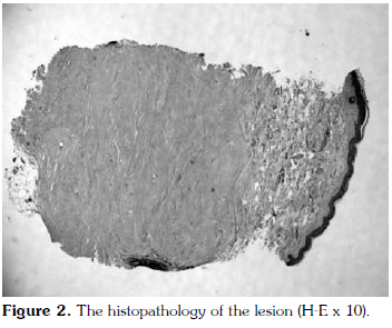 As a result of clinical, pathological evaluation and laboratory examination, the patient was diagnosed with circumscribed morphea (localized scleroderma). She had only one lesion and topical clobetasol propionate was applied once a day as the treatment. Clinical improvement in the lesion was evident by the end of six weeks. In the clinical follow-up, there was no new lesion and recurrence was not seen in the old lesion.