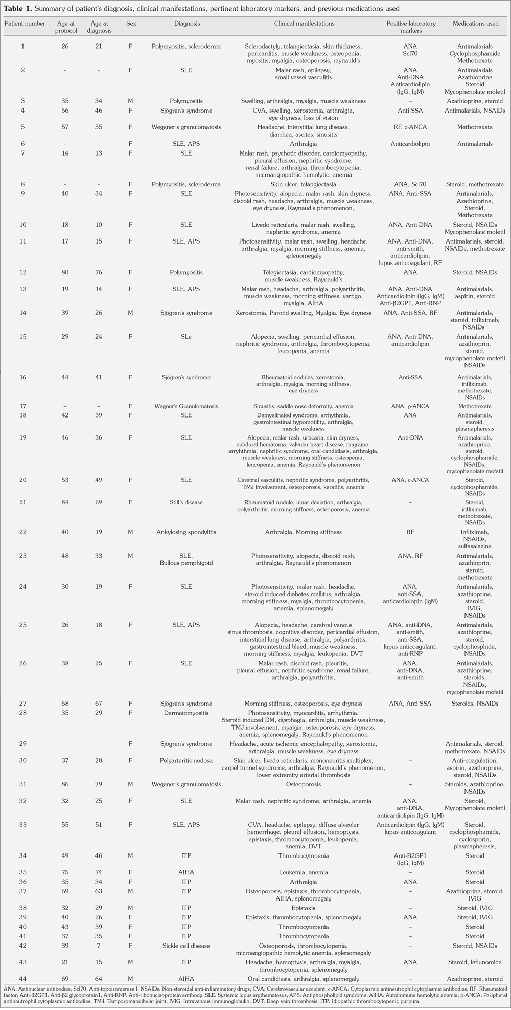 The mean age at diagnosis was 36.4±19.8 years, and the mean age at study enrollment was 44.5±19.1 years. The mean chronicity of the disease is 7.4±6.4 years. Seventeen patients had SLE. Patients with other inflammatory diseases were also reported in decreasing frequency as follows: ITP (n=8), APS (n=5), Sjögren's syndrome (n=5), polymyositis (n=4), Wegener’s granulomatosis (n=3), autoimmune hemolytic anemia (AIHA) (n=2), scleroderma (n=2), Still’s disease (n=1), dermatomyositis (n=1), pemphigus v ulgaris (n=1), bullous pemphigoid (n=1), ankylosing spondylitis (n=1), polyarteritis nodosa (n=1), and sickle cell disease (n=1). The diagnoses, clinical manifestations, previous treatments and outcome are summarized in Table 1. Previous treatment modalities were documented; and the most widely used drugs were corticosteroids in 39 patients, non-steroidal anti-inflammatory drugs (NSAIDs) in 23 patients, anti-malarial drugs (n=17), azathioprine (n=15) and methotrexate (n=14). Other regimens such as mycophenolate (n=7), cyclophosphamide (n=6), cyclosporine, infliximab (n=5), and IVIG (n=5) were also used, but to a lesser extent.