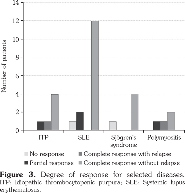 The responsible treating physician identified the patient’s response to rituximab in dermatologic and rheumatologic diseases according to symptoms and signs. Response rate was categorized as: (i) complete response without relapse meaning that the patient attained remission by regression of symptoms and signs without the appearance of other signs and symptoms, (ii) complete response with relapse, (iii) partial response meaning improvement in one or more of the symptoms and signs, and (iv) no response. Improvement in cell counts and remission was documented for ITP and thrombotic thrombocytopenic purpura patients. Patients were evaluated for a follow-up period of two years. Data analysis was performed using the PASW Statistics version 18.0 for Windows software program (SPSS Inc., Chicago, IL, USA). On the other hand, frequencies were extracted using descriptive statistics, while means were compared using the paired sample T test. A P-value less than or equal to